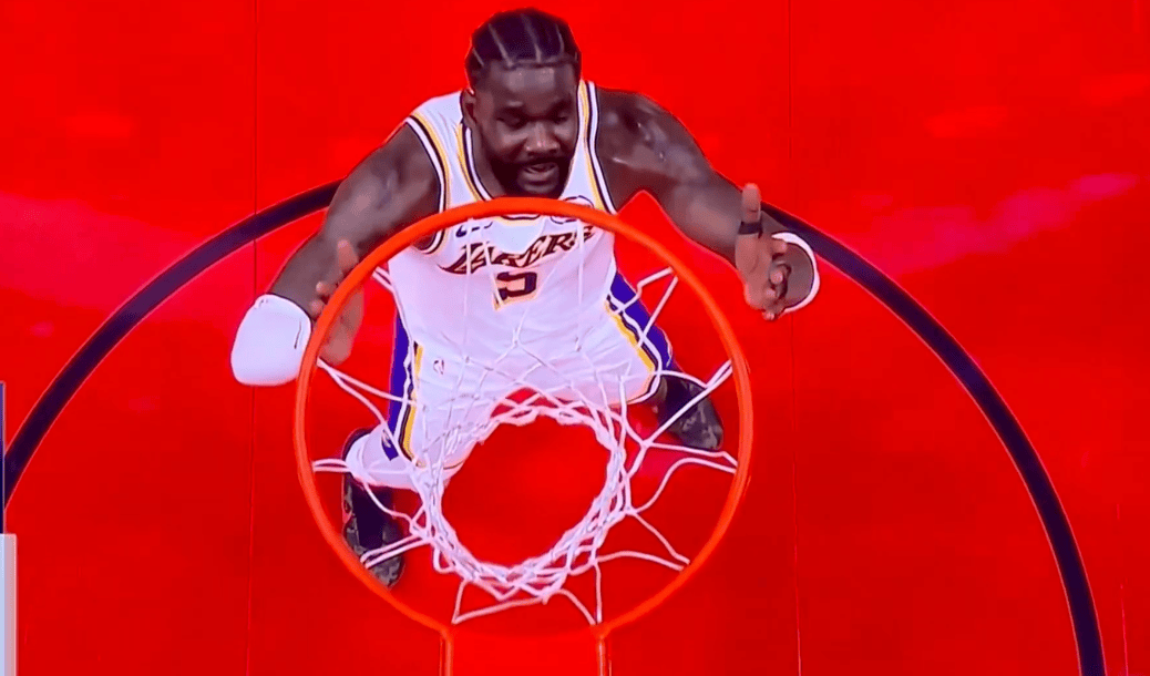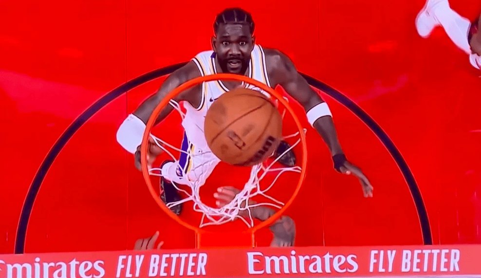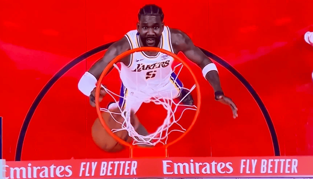 赛后,美媒Brick Center晒出了湖人中锋德安德烈-艾顿在一次看着火箭球员进球时的篮筐上方视角。
